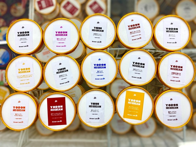 2013年にヨロン島の地域食材を活かして何か特産品となれるようなデザートが作れないか?との思いから開発挑戦が始まり、やはり暑い暑いこの与論島で島人にも旅人にも永く愛され喜ばれるのはきっとアイスクリームだ‼︎と確信。誕生したのがこのヨロンアイスクリームです。歴史は浅いですが毎年同じ旅人が食べにいらして頂けるなどヨロン島ではメジャーな存在となってきました。 げ 【塩バニラ】 ヨロン島沖の海洋深層水から作られた塩「深美塩」使用。海と同じエメラルドグリーン色のさっぱりバニラ味。 【サトウキビ焦がしキャラメル】 ヨロン島産サトウキビから作られるキビザラメ100%使用。焦がしてあるのでビターで濃厚な大人味。 【PREMIUM島バナナミルク】 ヨロン島産バナナ100%使用。決して市場に出回ることのないバナナで島人はモンキーバナナと呼んでいます。甘みと酸味が強く野性味溢れる味です。台風のない年にしか収穫できないプレミアムなバナナです。 【塩マンゴー】 ヨロン島沖の海洋深層水から作られた塩「深美塩」使用。トロピカルなマンゴーの甘さを引き立てます。 【塩小豆】 ヨロン島沖の海洋深層水から作られた塩「深美塩」と北海道産大納言小豆がコラボした和の逸品。小豆のコクある甘みがくせになります。 【塩ティラミス】 コーヒー、クリームチーズ、ラム酒等を加え大人な味わいのティラミスアイスにヨロン島沖の海洋深層水から作られた塩「深美塩」を加えることにより、よりリッチな味わいに仕上げてあります。 【塩チーズケーキ】ヨロン島沖の海洋深層水から作られた塩「深美塩」使用。「深美塩」を加えることにより濃厚な味わいでありながらしつこくなく仕上げてあります。 【オーガニック島みかん】与論島でオーガニックのフルーツや野菜を作っている「シャロン農園」さんが有機栽培で育てた島みかんをふんだんに使ったシャーベット。酸味が強い島みかんですが食べるほどに甘みを強く感じます。 ※実店舗の在庫と共有している関係上、アイスの種類をお選びいただくことはできませんが、できる限り希望を受けますので好みがあればお申し付けください。