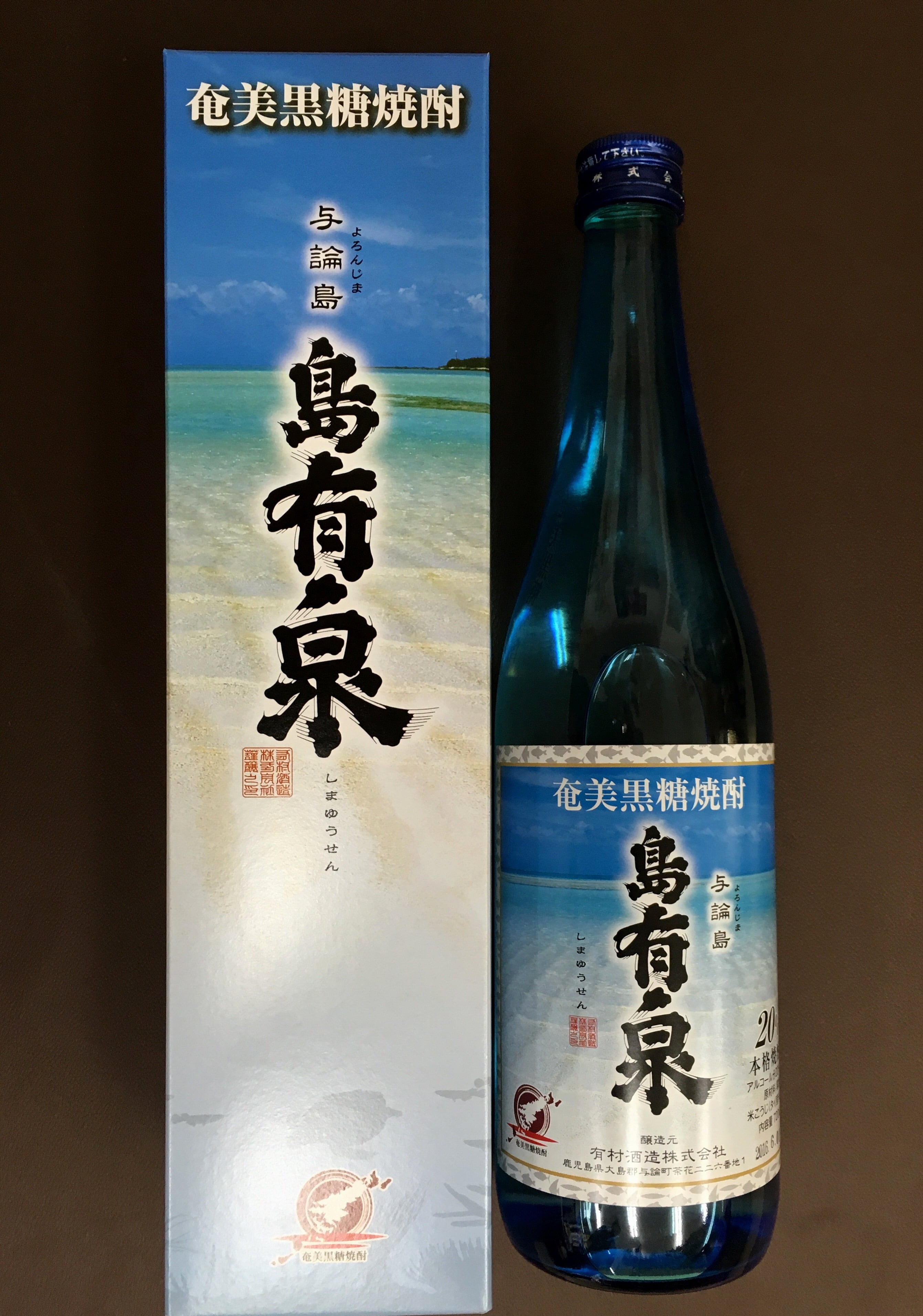 島有泉720ml20度化粧箱入り※与論島の海をイメージしたブルーのボトル入り化粧箱には百合ヶ浜がプリントされ贈答用に最適です。