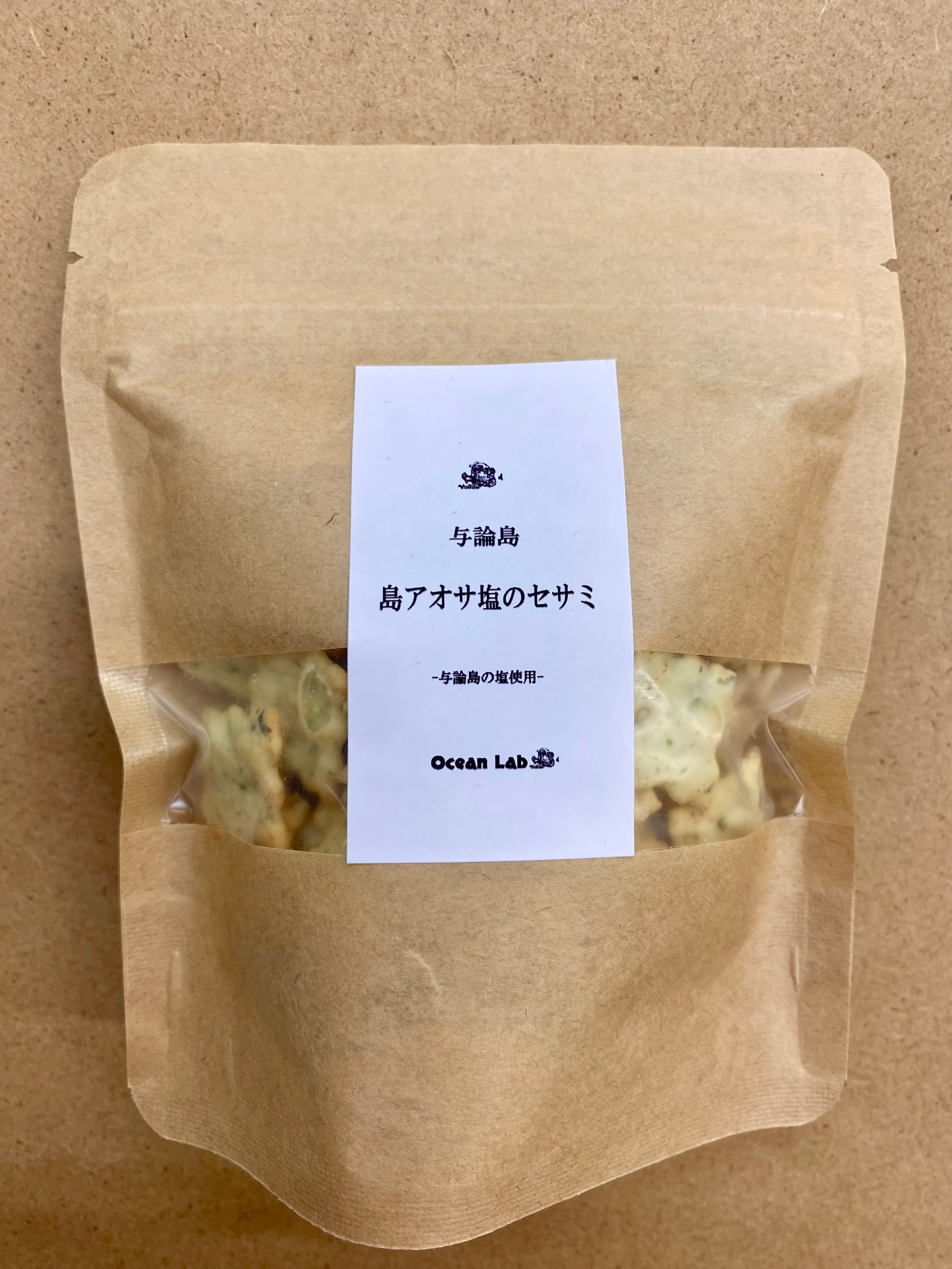 与論島の海塩はマグネシウムやカルシウム、カリウムなどミネラル分も豊富に含むためただ塩辛いだけではなくまろやかで複雑な旨味がある塩です。この塩で味付け、アオサを練りこむことで、磯の風味が活きたとても美味しいセサミになりました。おやつとしても、お酒のつまみとしても最高のスナックです。ぜひ与論島のお酒とともにお楽しみ下さい。